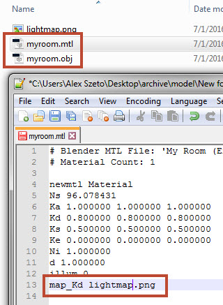 - The export action should generate two files in the target folder: the object (OBJ) file and the material (MTL) file. Open the material file with a text editor (Notepad works, although it would scrunch all the text into a single line) and at the very end of the file look for the words map_Kd and make sure that if there's an absolute path to the file (C:\Some Folder\lightmap.png), change it to just the name of the file (lightmap.png).