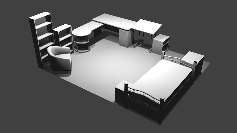 At this point, I should point out that I have not applied any texture to any of the objects I made to make my job easier - if you'd like to have the objects textured, You'll probably want to watch the other tutorial after you're done with this one to get the full story on how to get different textures working as well. To clear out all the existing materials on the model, with the room model selected go to the Material tab in the Properties panel (it has an orange ball icon), and hit the minus button to the right to keep deleting materials until the panel is empty. Make a new material by pressing the +new button at the bottom, and you should end up with the default white material applied: